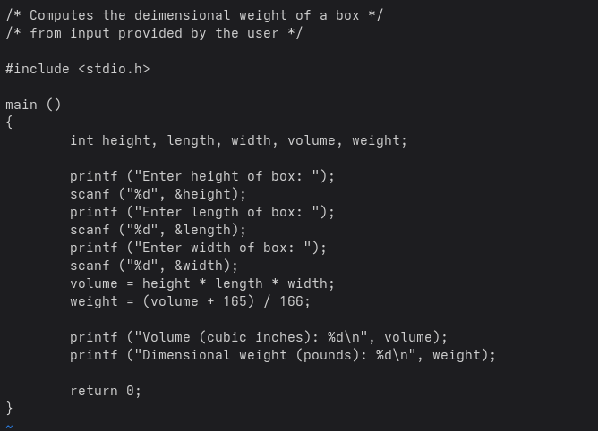 The following is an improved variant of the dweight.c program. King notes that calls of scanf are always preceded by a call of printf, so that the user can be told what he is expected to enter and when to do so.