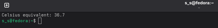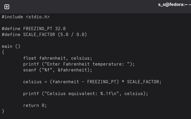 In the following program the user can enter a Fahrenheit temperature: them it prints the equivalent Celsius temperature. The output of the program will be: