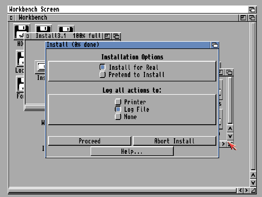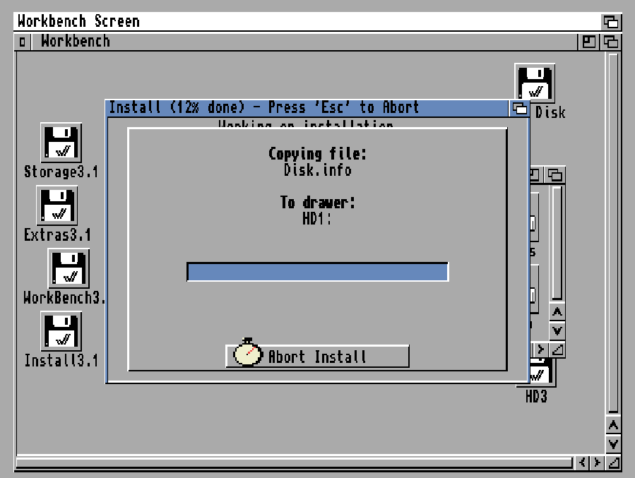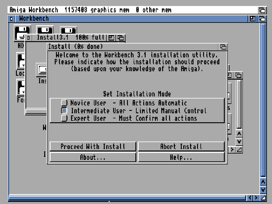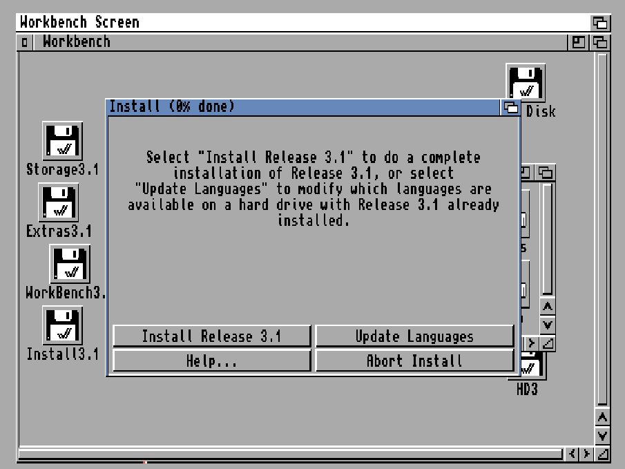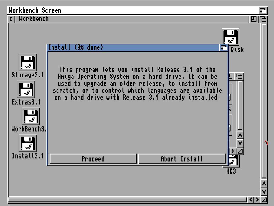 8. Starting the installation of the Amiga gui desktop part of the OS: Workbench 3.1 (0%)