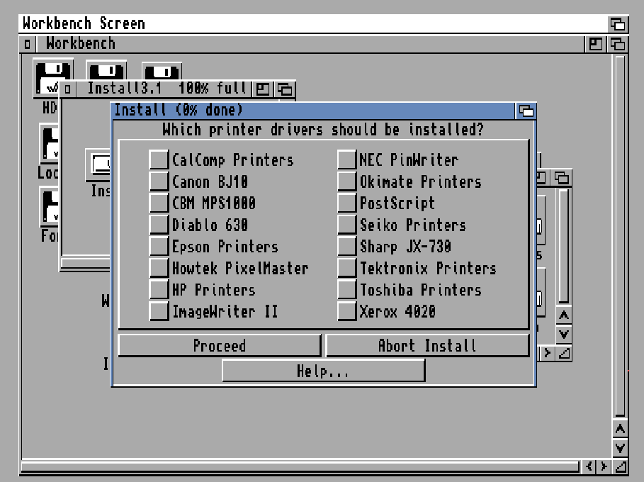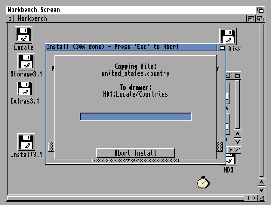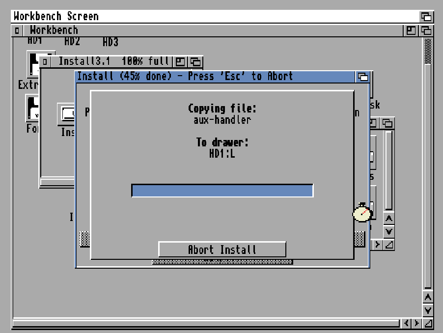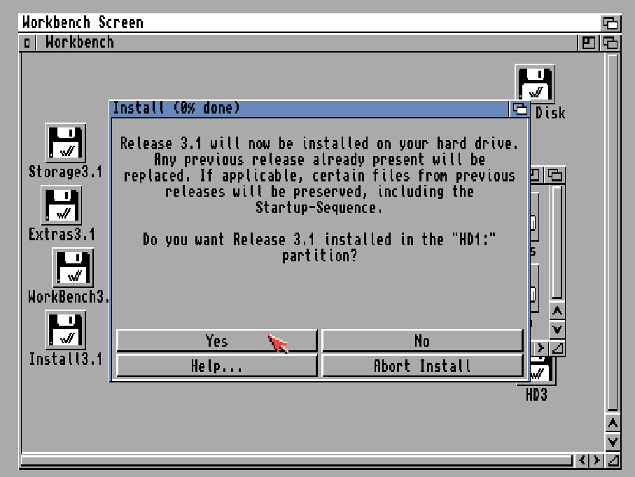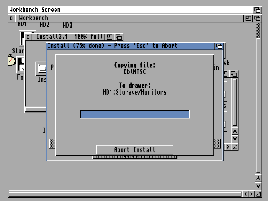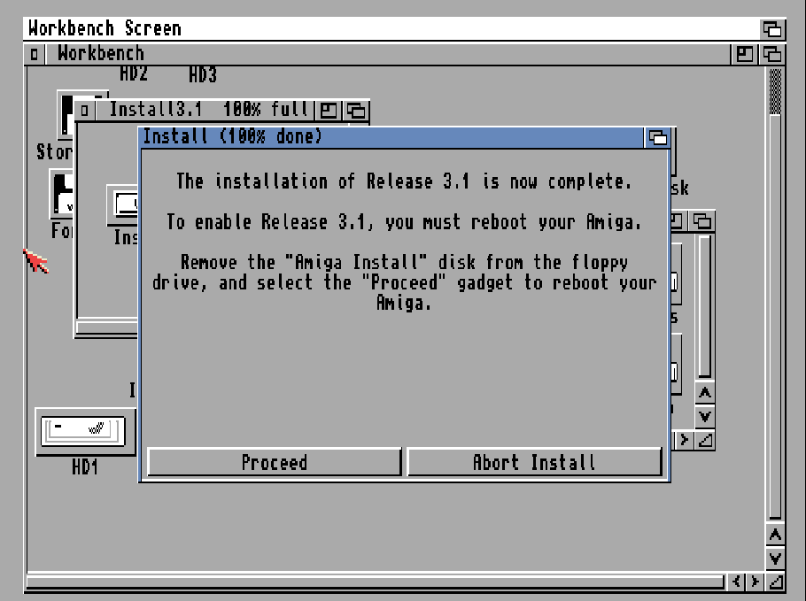 8. Starting the installation of the Amiga gui desktop part of the OS: Workbench 3.1 (0%)