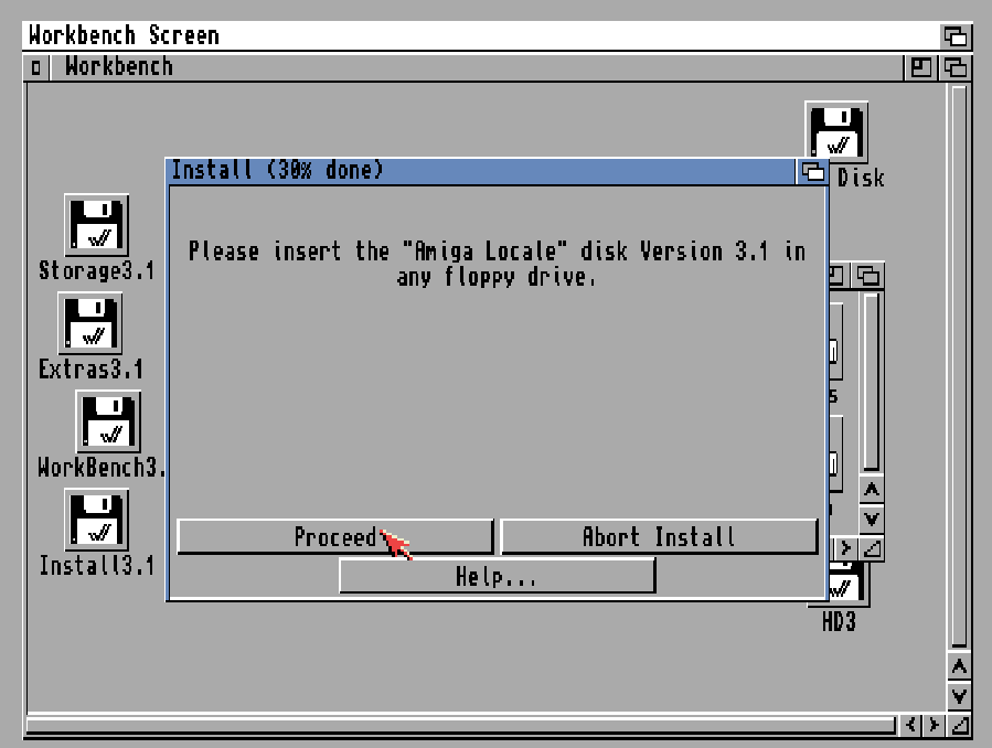 16. Workbench 3.1 installation: Switching Floppy Disks (30 (my emulation has 4 drives and the installation uses 6)